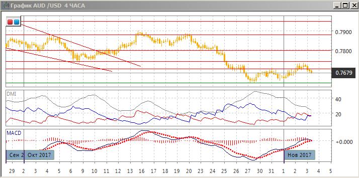 На четырёхчасовом графике видно, что после консолидации выше ранее преодолённого уровня 0,7700 пара вышла из неё вниз, что не характерно для тенденции роста. Возвращение в консолидацию ниже 0,7700 (с 26 октября) делает более предпочтительным дальнейшее снижение ближе к минимумам 27 и 31 октября выше 0,7625. По индикаторам направленного движения в этом масштабе флэт: DM+ и DM- близки при снижении ADX, гистограмма MACD снижается около нуля при положительном наклоне линии MACD.