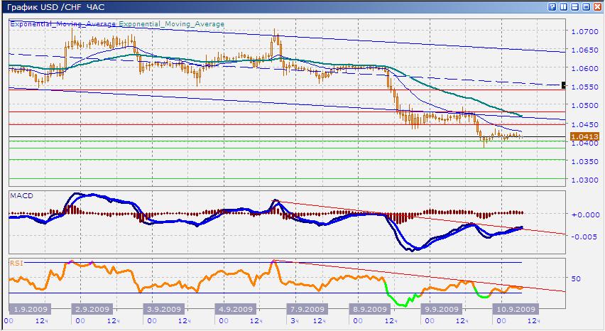 Паре в ходе торгов во вторник удалось выйти вниз из нисходящего канала, в котором она двигалась с 10 августа, и одно временно выйти из бокового тренда, в пределах которого она торговалась с 19 августа. Выход вниз был уверенным, пара показала сессионный минимум на 1.0431. Затем пара торговалась в пределах 1.0440-1.0480 со слабыми попытками выйти выше сопротивления 1.0480. Но нижние границы нисходящего и бокового каналов оказали паре сопротивление, от которого она откатилась к минимумам самого конца 2008 года. Сейчас пара торгуется около уровня сегодняшнего открытия. Средние скользящие ЕМА21 и ЕМА55 более чем уверенно идут вниз, индикаторы MACD и RSI показывают рост, но это рост под центральными линиями и его сила весьма условна. Нисходящее движение сейчас нацелено на выход ниже поддержки 1.0400, если это сделать удастся, то пара дальше пойдет к 1.0350 и 1.0300 далее. Цель вверх — 1.0440-1.0450, 1.0480 (где будет сопротивление от ЕМА55).