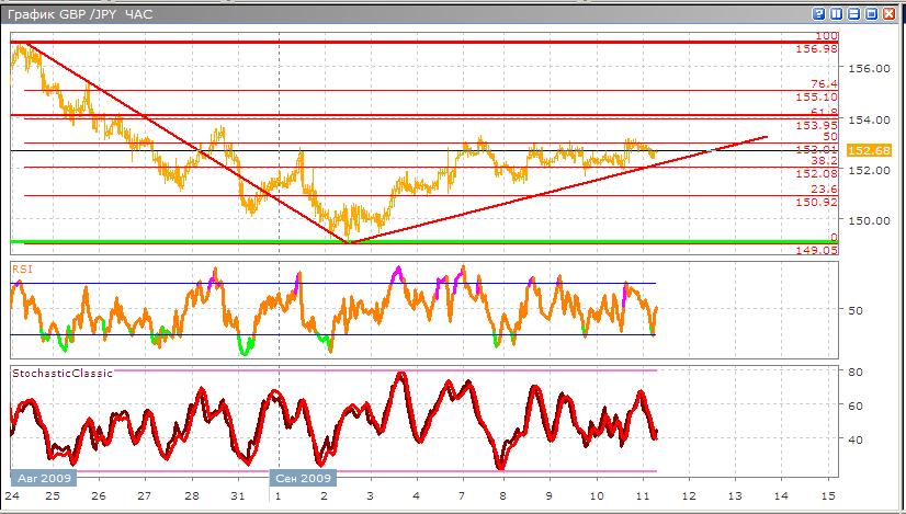 Валюта находится во флете между уровнями 23,6 и 50% по Фибоначчи. Потенциал роста сохранился, но возможны коррекционные движения. Пока движение проходит по линии вверх, если пробоя не будет этой линии, то скорее всего сила движения сохранится. Хотя сейчас становится сильнее йена на фоне положительных экономических новостей по данных ВВП. И фунт, тоже становится сильнее по отношению к доллару. Обратившись к индикаторам тех анализа, таким как Stohastic, движение вверх можно будет подтвердить, на что также указывает RSI.