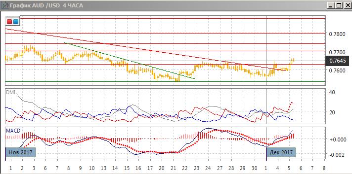 На четырёхчасовом графике видно, что пара преодолевает уровень 0,7625 после тестирования этого уровня с 22 ноября. Исходя из тестирования уровня сопротивления, важно, закрепится ли пара выше, или быстро вернётся ниже (что создаст ситуацию ложного пробоя, что было и ранее). Исходя из того, что пробой уровня был на важных фундаментальных данных (по розничным продажам и при выходе решения РБА), скорее это не ложный пробой, и стоит ожидать роста пары в краткосрочной перспективе. Относительные максимумы и минимумы пары сейчас растут. По индикаторам направленного движения тенденцией стал рост: превышение DM+ над DM- увеличивается при росте ADX, гистограмма MACD растёт в положительной зоне, линия MACD имеет положительный наклон.