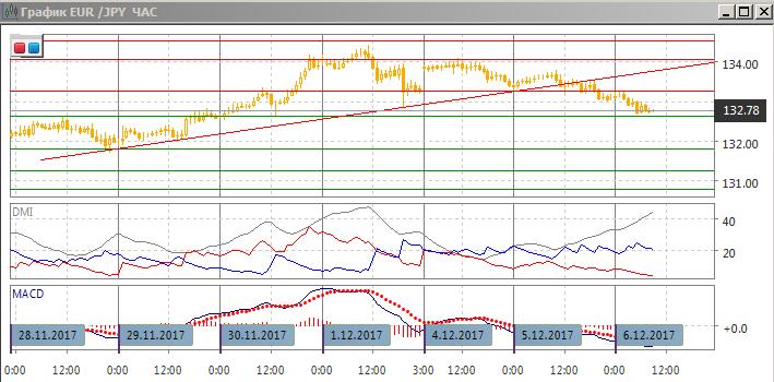 Пара преодолела относительный минимум 1 декабря и приблизилась к уровню 132,60 — около относительного минимума 30 ноября и сопротивления 28 ноября. Пара продолжает снижаться ниже краткосрочной линии восходящего тренда, это снижение проходит в более широком диапазоне 134,50-131,80 — предпочтительный является движение к нижней границе диапазона, так как пара пара преодолела ближайшие сопротивления и более нельзя предполагать консолидацию у верхней границы диапазона с возможным выходом вверх. По индикаторам направленного движения тенденция снижения усиливается — превышение DM- над DM+ большое, линия ADX находится на высоком уровне и растёт, гистограмма MACD/