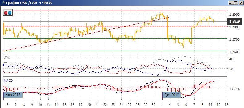 На четырёхчасовом графике пара продолжает расти от 1,2625, но темп роста замедляется. Последний относительный минимум был ниже предыдущего, и возможно образование вершины у 1,2880. Возможный разворот виден по снижению гистограммы MACD (она достигла нулевого уровня) и разворот линии MACD. По ADX рост уже не является тенденцией. Краткосрочно, движение к 1,2800 видится предпочтительным.