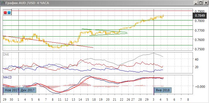На четырёхчасовом графике похожая картина — последовательность роста относительных максимумов и минимумов пары сохраняется, по ADX тенденция роста сохраняется — превышение DM+ над DM- устойчивое, хотя и уменьшается. ADX остаётся на высоком уровне. Закрепление пары выше уровня 0,7800 предполагает, что рост скорее продолжится до следующего уровня сопротивления 0,7900, пока пара выше 0,7800.
