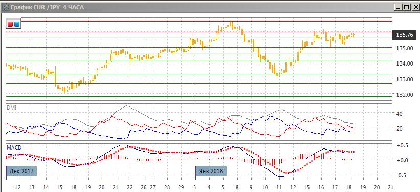 На четырёхчасовом графике пара находится в консолидации между 135 и 136. В рамках движения в канале предпочтительно снижение, так как пара недавно достигла верхней границы. Выход из канала предпочтителен вверх, так как это направление предыдущего движения. При преодолении уровня 136 предпочтительным видится рост пары к 136,65 (у максимума января). По индикаторам направленного движения флэт: DM+ и DM- близки, гистограмма MACD около нуля, линия MACD близка к горизонтали.