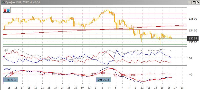 На дневном графике пара вновь удержалась выше уровня 132,00. Зона между 131,50 и 132,50 является сильной поддержкой для пары, так как в августе-сентябре это была зона сопротивления, а в сентябре-декабре зона вступала поддержкой для пары. Отскок 14 февраля остался ниже уровня 133,25. Пара может снова снизиться до поддержки на 132,00. Дальнейшее снижение будет возможно при преодолении уровня 131,50. Последовательность снижения относительных максимумов и минимумов пары сохраняется. По ADX тенденция снижения усиливается: ADX растёт, превышение DM- над DM+ увеличивается. Линия MACD сохраняет отрицательный наклон.