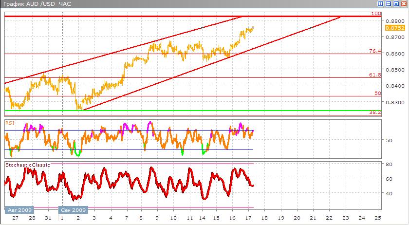 Австралийский доллар продолжает двигаться в возрастающем канале новому уже уровню - 0,8822. Сейчас мы видим, как после отскока от нижней границы канала, движение вверх сохраняется достаточно сильное, скорее всего эта точка в скором времени будет достигнута. Другие индикаторы технического анализа подтверждают продолжающиеся восходящее движение, так например Stohastic развернулся вверх в сторону зоны перекупленности, а RSI тоже совершил этот разворот направляется вверх. После того как данные точка будет достигнута возможен разворот к основанию канала.