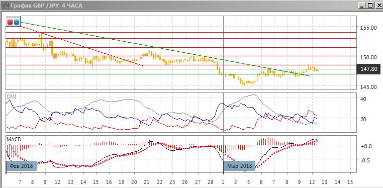На четырёхчасовом графике также продолжается рост пары от 145,00, был преодолён уровень максимумов 6 и 8 марта. Относительные минимумы пары последовательно растут от 145,00. Пара преодолена ближайшие сопротивления, и продолжение роста пары кажется предпочтительным. По индикаторам направленного движения рост является слабой тенденцией: DM+ немного выше DM-, гистограмма MACD остаётся в положительный области, линия MACD сохраняет положительный наклон.