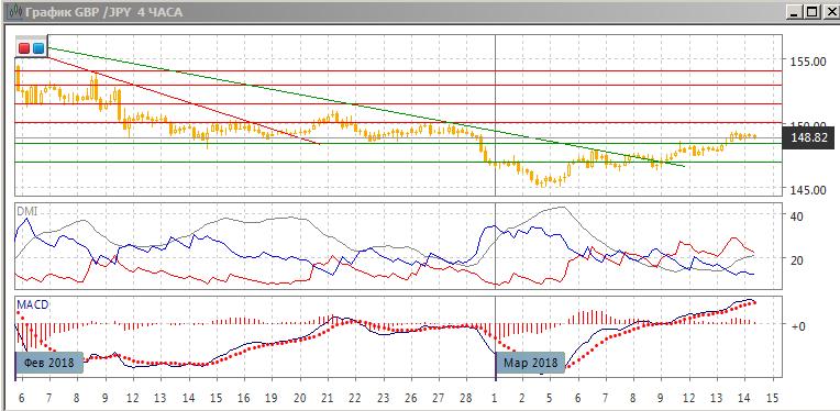 На четырёхчасовом графике продолжается рост пары от 145,00. Относительные минимумы пары последовательно растут. Пара закрепилась выше уровня 148,50 — около этого уровня был ряд минимумов во второй половине февраля, и сопротивление 9-13 марта. По индикаторам направленного движения тенденцией является рост: DM+ выше DM-, ADX выросла выше уровня 20, гистограмма MACD остаётся в положительный области, линия MACD сохраняет положительный наклон. Пока пара выше 148,50, продолжение роста до 150,00 кажется предпочтительным, дальнейший рост — после 150,00.