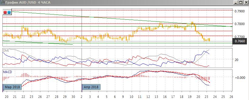На дневном графике пара снизилась от сопротивления на уровне 0,7800 и находящейся там же верхней границы нисходящего канала с начала февраля. Пара снизилась до минимумов конца марта — начала апреля, где может получить поддержку несмотря на энергичное снижение в течение двух дней. По индикаторам направленного движения выраженной тенденции нет: DM- и DM+ близки, ADX на низком уровне, гистограмма MACD в целом продолжает колебания около нуля. При закрытии ниже 0,7645 открывается пространство для дальнейшего снижения, и следующая сильная поддержка будет только на «круглом» уровне 0,7500.