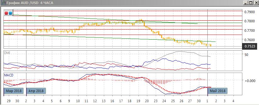 На дневном графике продолжается снижение без отскоков от 0,7800, постепенно пара приближается к психологически важному уровню 0,7500. Пара находится около минимумов ноября и декабря 2017 г. Пара находится ниже минимума ноября. Также она закрепилась ниже нижнего уровня нисходящего канала с февраля. По индикаторам направленного движения тенденцией является снижение: DM- значительно выше DM+, ADX растёт, гистограмма MACD снижается в отрицательной зоне, линия MACD имеет отрицательный наклон. Пара остаётся у уровня перепроданности по RSI. Скорее, уровень 0,7500 будет тестироваться и снижение сейчас выглядит предпочтительным, но отскок от 0,7500 вероятен так как это сильный уровень поддержки.