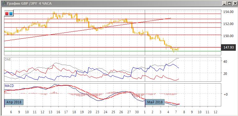 На четырёхчасовом графике снижение пары приостановилась на уровне 147,30 (это сильный уровень поддержки в дневном масштабе). Отскок выше, однако, пока ограничивается ранее преодолённым сопротивлением на 148,00. По ADX тенденция снижения очень сильная: превышение DM- над DM+ очень больше, ADX на высоком уровне растёт. Сохраняется бычье расхождение минимумов пары и гистограммы MACD. Пара остаётся в зоне перепроданности от RSI, что увеличивает вероятность отскока, однако подобная ситуация была с 27 апреля. Более краткосрочно пара, вероятно, будет двигаться в направлении выхода из консолидации между 147,30 и 148,00. Более долгосрочно продолжение снижения остаётся предпочтительным.