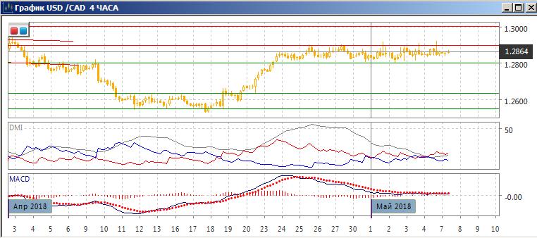 На четырёхчасовом графике продолжается движение в диапазоне 1,2800-1,2900. В рамках движения в диапазоне пара движется к нижней границе после приближения к верхней. Тестирование уровня 1,2900 приводит к образованию «падающих звезд», что показывают отсутствие поддержки для роста выше 1,2900 на данный момент. Однако перехода к снижению пока не просматривается. Скорее, в данный момент стоит подождать выхода пары из диапазона и действовать в сторону выхода из диапазона.