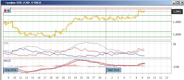 На дневном графике пара вышла из консолидации 1,2800-1,2900 вверх. Пара достигла следующего «круглого» уровня на 1,3000. Пара преодолела уровень сопротивления на максимумах октября-декабря 2017 г. (1,2920), и это упрощает дальнейший рост. Так как пара вышла из консолидации 1,28-1,29 вверх, скорее рост продолжится, и пара может иметь целью движение к максимуму марта на 1,3128. По ADX сохраняется тенденция роста: DM+ выше DM-, ADX остаётся на высоком уровне. Гистограмма MACD остаётся в положительной зоне, при этом медвежье расхождение максимумов пары и гистограммы MACD сохраняется.