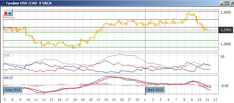 На четырёхчасовом графике пара перешла к снижению от 1,3000. Относительные максимумы и минимумы пары сейчас снижаются. По индикаторам направленного движения пара перешла к снижению: DM- выше DM+, гистограмма MACD снижается в отрицательной зоне, линия MACD имеет отрицательный наклон. Пара закрепилась ниже нижней границы предыдущего канала 1,2800. 10 мая уровень выступил уже сопротивлением при отскоке (при этом образовалась «падающая звезда»). Пока продолжение снижения кажется предпочтительным.