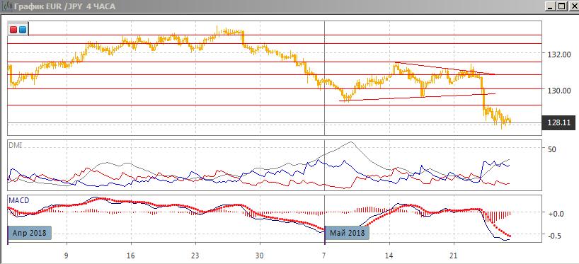 На четырёхчасовом графике пара вышла из треугольника вниз, получив поддержку на 128,00. Отскок от этого уровня был ограничен предыдущим уровнем поддержки 129,00 и пара вернулась к исходному уровню. Консолидация пары выше 128,00 вероятно завершится продолжением снижения. По ADX в этом масштабе тенденция снижения сильная: превышение DM- над DM+ большое, ADX на высоком уровне.
