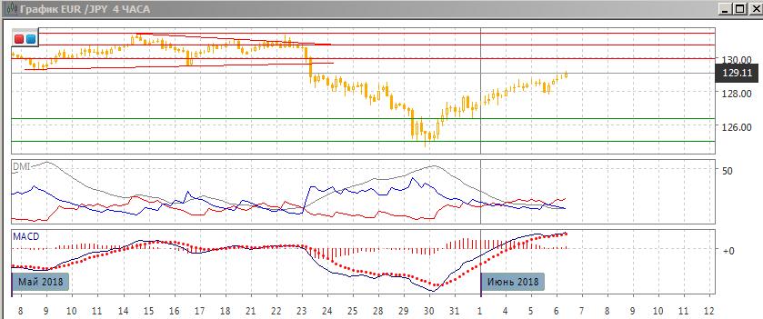 На четырёхчасовом графике рост замедляется. Хотя пара получила поддержку при откате от 129,00 на 128,00, замедление роста видно по образованию медвежьего расхождения максимумов пары и гистограммы MACD. , что увеличивает вероятность отката. Наклон волны роста от 125 также уменьшается. По ADX рост является слабой тенденцией. Сейчас рассчитывать на дальнейший рост, вероятно, рискованно.