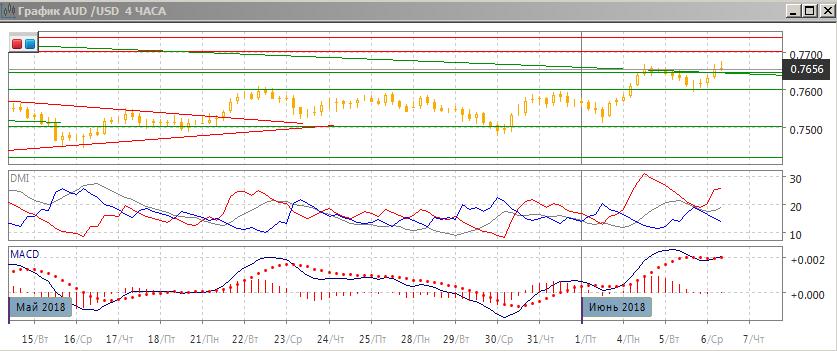 На четырёхчасовом графике пара при откате получила поддержку на уровне верхней границы канала, их которого она вышла вверх — 0,75-0,76, что подтверждает переход к росту. Пара в начале среды достигла более высокого максимума, чем предыдущий, на более высоком, чем ожидалось, росте ВВП в первом квартале, однако продолжения роста после первоначальной реакции не было. Исходя из этого, пока не видно катализаторов, которые могли бы толкнуть пару выше. В рамках движения между целью измеренного движения 0,7700 (движение, равное ширине канала), и поддержкой на 0,7600, более вероятно тестирование верхней границы, но краткосрочно пара, вероятно, останется в диапазоне.
