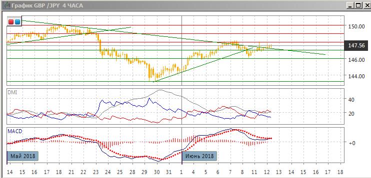 На четырёхчасовом графике пара получила поддержку на 146,00, после чего пара вернулась к сопротивлению на 148,00. Ниже этого уровня образовались две «падающие звезды», не получившие развития. Пара после преодоления уровня 147,00 получила на нём поддержку 11 мая. Дальнейшее движение, вероятно, будет в сторону выхода пары из диапазона 147,00-148,00.