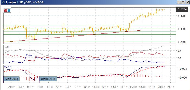 На дневном графике пара продолжает расти после преодоления «круглого» уровня 1,3000. Ближайшей обоснованной поддержки не видно, по облегчает дальнейший рост после прорыва уровней сопротивления 2017 и 2018 г. Во вторник было закрытие выше «круглого» уровня 1,3200. По индикаторам направленного движения тенденция снижения сильная%: превышение DM+ над DM- большое и оно увеличилось, ADX растёт, гистограмма MACD растёт в положительной зоне, линия MACD имеет положительный наклон. Ограничением может быть то, что рост от 1,3000 уже превысил диапазон 1,2740-1,3000, в котором пара находилась с апреля, что может быть целью измеренного движения. Кроме того, размер роста в 300 пунктов без коррекции уже велик. Однако в целом продолжение роста является предпочтительным.