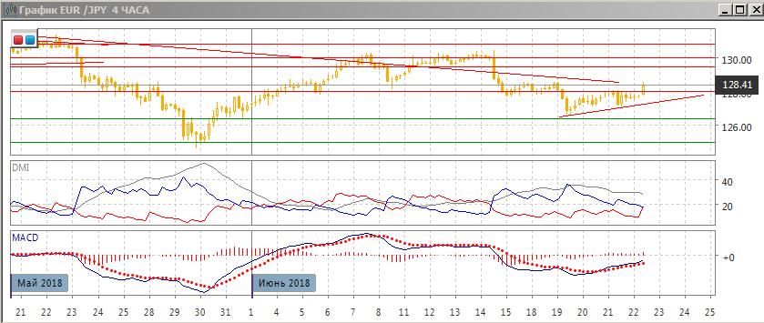 На четырёхчасовом графике пара тестирует уровень 128,00, что началось 20 июня. Относительные минимумы пары сейчас приближаются к этому уровню и образуется направленный вверх треугольник с верхней границей на 128,00. Выход из треугольника приближается. Вероятно, дальнейшее движение будет в направлении выхода пары из него. По индикаторам направленного движения — коррекция к снижению: DM- выше DM+, ADX на высоком уровне, гистограмма MACD выросла в положительную зону, линия MACD имеет положительный наклон.