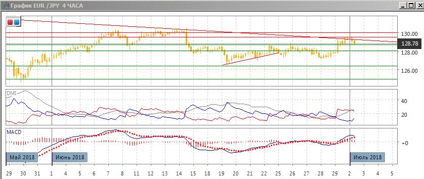 На четырёхчасовом графике пара перешла к росту, разворот произошёл при приближении к 127,00 (ранее эта зона проявилась 19-21 июня). Пара преодолела сопротивление на 128,70 (это важный уровень в июне, около которого образовался ряд относительных максимумов и минимумов). Прорыв уровня 128 был резким. По индикаторам направленного движения тенденцией является рост: DM+ выше DM-, ADX вырос и рост продолжается, линия MACD имеет положительный наклон, гистограмма MACD в положительной зоне. Ограничением сверху сейчас служит более долгосрочная линия тренда. Поддержки можно ожидать на 128,70. Пока пара выше этого уровня рост кажется предпочтительным, но стоит подождать закрепления выше линии тренда.