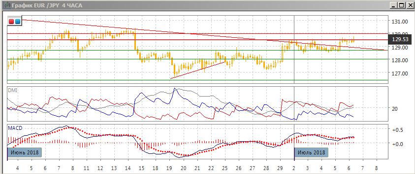 На дневном графике пара выросла выше линии нисходящего тренда, если строить её с середины апреля. Последовательность роста относительных максимумов и минимумов пары сохраняется с середины июня. Также пара преодолевает важный уровень поддержки/сопротивления 129,50. Это, вместе с преодолением линии тренда, открывает пространство для дальнейшего роста пары. По индикаторам направленного движения тенденцией является рост: DM+ сейчас выше DM-, гистограмма MACD растёт в положительной зоне, линия MACD имеет положительный наклон. Ближайшее сопротивление в этом масштабе на 130,30 — на максимумах июня. Далее сильное сопротивление на 131,50, это будет близко к 200-дневной средней.