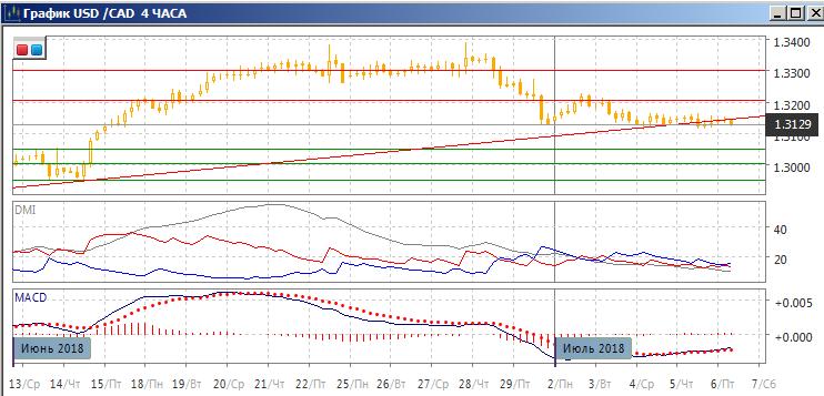 На четырёхчасовом графике пара тестирует уровень 1,3130, у минимума конца июня, где приостановилось резкое снижение от 1,3400. Постепенное приближение относительных максимумов к 1,3130 делает более вероятным преодоление того уровня и продолжение снижения. По индикаторам направленного движения в этом масштабе флэт: DM+ и DM- близки при низком уровне ADX. Гиcтограмма MACD около нуля. Наклон линии MACD слабый. Скорее, стоит рассчитывать на продолжение снижения, но действовать только после закрепления ниже 1,3130.