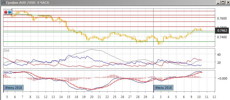 На четырёхчасовом графике происходит консолидация выше ранее преодолённого уровня сопротивления на 0,7445. Исходя из того, что пара остаётся выше этого уровня и тенденцией в этом масштабе является рост, скорее рост возобновится с тестированием психологически важного уровня 0,7500. По индикаторам направленного движения тенденцией является рост: DM+ выше DM- при росте ADX, снижение гистограммы MACD и переход к горизонтали линии MACD происходит из-за горизонтальной консолидации.