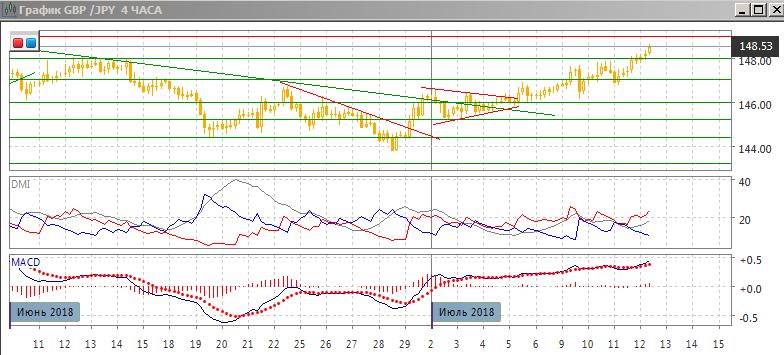 На четырёхчасовом графике пара последовательный рост пары продолжается, последовательность роста относительных максимумов и минимумов не нарушена. Признаков замедления роста нет и в этом масштабе. Однако пара сейчас вновь приблизилась к уровню перекупленности по RSI, 9 июля это закончилось откатом. До 150,00 сильного сопротивления не видно, и скорее этот уровень будет тестироваться.