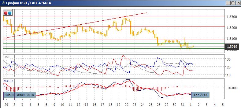 На дневном графике пара достигла нового минимума после снижения от 1,3300, и находится у уровня сопротивления 1,3000, что является психологически важным уровнем. Закрытия ниже пока не было. Если это произойдёт, далее сильная поддержка видится только на 1,2800. Также кажется важным, что пара закрепилась ниже минимумов июня у 1,3050. По индикаторам направленного движения тенденцией остаётся снижение: DM- выше DM+, гистограмма MACD снижается уже в отрицательной зоне, линия MACD сохраняет отрицательный наклон.