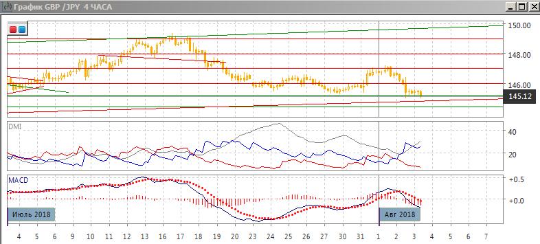 На четырёхчасовом графике снижение пары приостановилось у относительных минимумов 27 и 31 июля. При этом отскока вверх, что показывает отсутствие поддержки для роста на данный момент и делает предпочтительным преодоление поддержки на 145,20. По индикаторам направленного движения тенденцией стало снижение: превышение DM- над DM- большое при относительно высоком уровне ADX, гистограмма MACD находится в отрицательной области, линия MACD имеет отрицательный наклон.