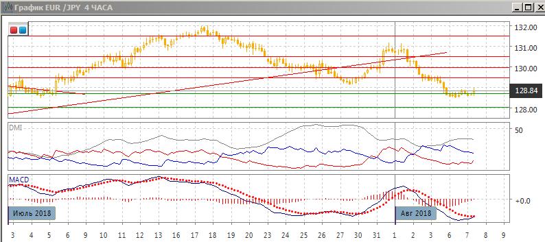 На четырёхчасовом графике снижение пары приостановилось, но сверху она ограничивается уровнем 129,00, продолжение снижения кажется предпочтительным, даже если будет некоторая коррекция вверх. По индикаторам направленного движения — коррекция к снижению, превышение DM- над DM+ значительное и устойчивое, ADX на высоком уровне. Гистограмма MACD растёт, но остаётся в отрицательной зоне.
