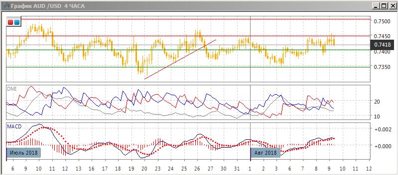 На четырёхчасовом графике также более вероятно снижение к «круглому» уровню 0,7445 после тестирования верхней границы канала. По индикаторам направленного движения в этом масштабе сохраняется флэт.
