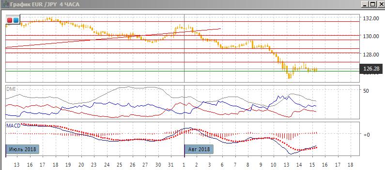 На четырёхчасовом графике отскок вверх закончился с достижением уровня 127,00, ниже него образовалась «падающие звёзды». Возвращения к исходному пункту коррекции пока не происходит, так как пара получает поддержку на 126,00. При преодолении этого уровня пара, вероятно, будет двигаться с точке начала коррекции на минимуме 13 августа. По индикаторам направленного движения — коррекция к снижению: превышение DM- над DM+ сохраняется, коррекция видна по росту гистограммы MACD (она перешла в положительную зону), линия MACD развернулась.