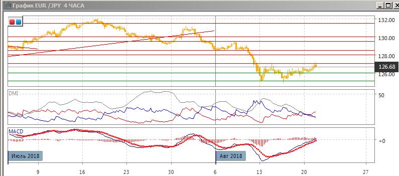 На четырёхчасовом графике пара выросла до максимума 14 августа. Можно представить движение в канале 125,15-127,00 с 13 августа. В рамках движения в диапазоне предпочтительно снижение к нижней границе на 125,15. Тенденция роста сейчас слабая, и пока не кажется, что пара преодолеет уровень 127,00, если это произойдёт, ситуация изменится.