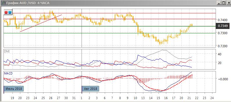 На четырёхчасовом графике тенденция роста усиливается, относительные максимумы и минимумы пары последовательно растут. По индикаторам направленного движения тенденцией является рост: превышение DM+ над DM- увеличивается, ADX на высоком уровне, линия MACD имеет положительный наклон, гистограмма MACD находится в положительной зоне. Уровень коррекции пары 61,8% к волне снижения с 8 августа достигнут, и при преодолении текущего уровня открывается пространство для роста до 100% - то есть исходного уровня снижения около 0,7450.