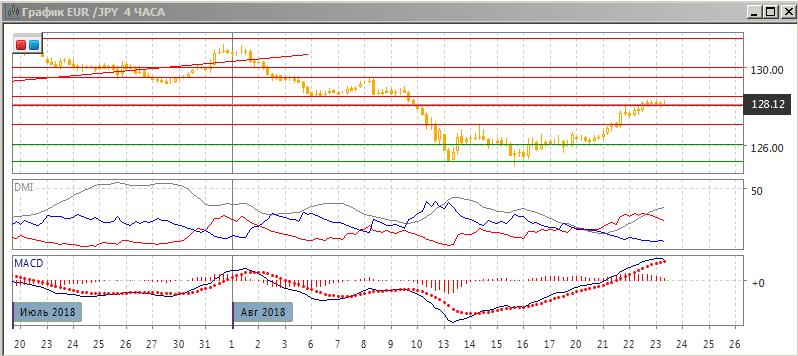 На четырёхчасовом графике рост приостановился около 128,00. Относительные максимумы и минимумы пары растут. По ADX тенденция роста стала сильно: DM+ значительно выше DM-, ADX на высоком уровне. Приостановка видна по снижению гистограммы MACD. Линия MACD сохраняет положительный наклон. По RSI пара достигла уровня перепроданности, поэтому для дальнейшего роста необходима консолидация или откат.