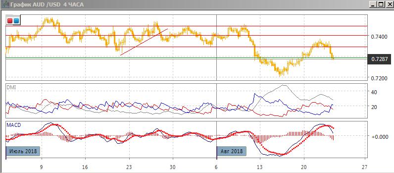 На четырёхчасовом графике тенденция изменилась после преодоления уровня 0,7345, выше которого пара консолидировалась. При сохранении тенденции роста от 0,7200 он продолжился бы после преодоления бывшей нижней границы канала. Однако преодоление линии поддержки изменило ситуацию, относительные максимумы и минимумы пары сейчас последовательно снижаются. По индикаторам направленного движения тенденцией стало снижение: DM- выше DM+, линия MACD развернулась вниз, гистограмма MACD снижается в отрицательной зоне. У «круглого» уровня 0,7300 может быть приостановка, но предпочтительным видится продолжение снижения.