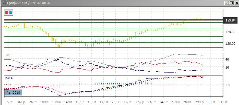 На дневном графике пара остаётся около сопротивления на 130,00. Преодоление уровня сопротивления на 130,00 может открыть дорогу к 200-дневной средней на 131,30, это около сильного уровня сопротивления. По индикаторам направленного движения тенденцией остаётся рост: DM+ выше DM-, гистограмма MACD растёт в положительной зоне, линия MACD получила положительный наклон. Так как отката от уровня 130,00 не происходит преодоление его теперь кажется более вероятным.