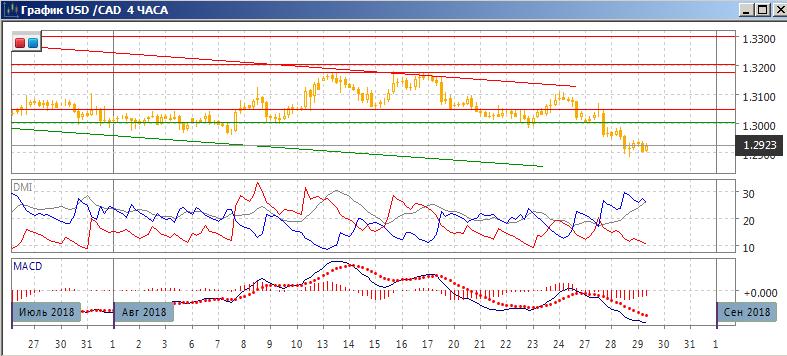 На четырёхчасовом графике относительные максимумы и минимумы пары последовательно снижаются. Существенного замедления снижения не видно. По ADX тенденция снижения является сильной и усиливается далее: превышение DM- над DM+ увеличивается, ADX на высоком уровне и растёт. Сейчас пара нашла поддержку на следующем «круглом» уровня 1,2900, но отскок от него не был большим, в вероятно уровень будет преодолён.
