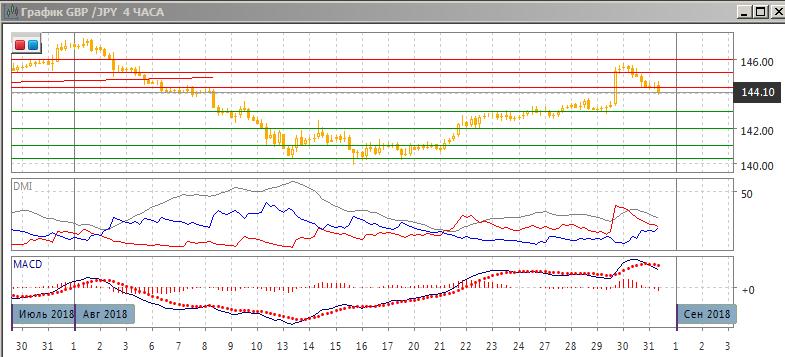 На четырёхчасовом графике пара достигла уровня поддержки на 144,00, откатившись после тестирования уровня 145,20. При дальнейшем снижении поддержка видится на уровне 143,00 — там рядом были максимумы и минимумы с 21 по 29 августа. Последовательность роста относительных максимумов и минимумов пары пока не нарушена.