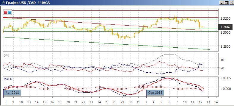 На четырёхчасовом графике тенденцией стало снижение, с образованием у 1,3200 плоской вершины. По индикаторам направленного движения также тенденцией стало снижение: DM- теперь существенно выше DM+, гистограмма MACD снижается в отрицательной зоне, линия MACD имеет отрицательный наклон. В зону перепроданности по RSI пара ещё не вошла. Выше 1,3050 снижение приостановилось, но отсутствие коррекции вверх скорее говорит о силе тенденции снижения (поддержки для коррекции нет), и более вероятным в краткосрочной перспективе видится снижение до психологически важного уровня 1,3000.