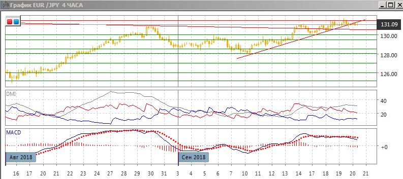 На четырёхчасовом графике рост пары замедлился и она снизилась ниже краткосрочной линии восходящего тренда с 10 сентября, что предполагает возможность более значительного отката. По ADX тенденция роста сохраняется, но гистограмма MACD снижается уже в отрицательной зоне, линия MACD имеет отрицательный наклон. Это может говорить о снижении в краткосрочной перспективе. Последовательность роста относительных минимумов и максимумов пары пока не нарушена. При откате ближайшая поддержка может быть на уровне 130,50 (у линии нисходящего тренда более высокого масштаба).