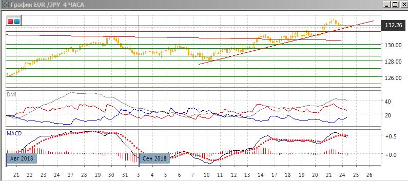 На дневном графике пара преодолела уровень сопротивления 131,50 и достигла максимумов апреля около 133. Ниже этого уровня образовалась свеча с большой верхней тенью, близкая к «падающей звезде». При этом разворота пока не было. Вероятность отката, даже при сохранении тенденции роста, увеличивает примерное равенство текущей волны роста с волной середины-конца августа (примерно 600 пунктов). При откате поддержка может быть на ранее преодолённом сопротивлении на 131,50. По ADX тенденция роста сохраняется — DM+ значительно выше DM-, ADX остаётся на высоком уровне. Сохраняется медвежье расхождение максимумов пары и гистограммы MACD.