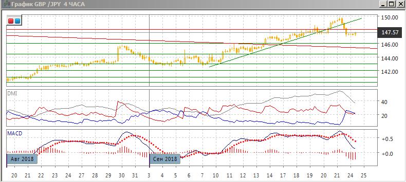 На четырёхчасовом графике пара перешла к снижению резким разворотом, при это она снизилась значительно ниже линии краткосрочного восходящего тренда с 7 сентября. Сейчас пара остановилась в узком диапазоне выше 147,20, это соответствует предыдущему относительному минимуму 19-20 сентября. Преодоление этого уровня приведёт к нарушению последовательности роста относительных максимумов и минимумов пары. По индикаторам направленного движения пара перешла к снижению: DM- уже немного выше DM+, гистограмма MACD снижается в отрицательной зоне, линия MACD имеет отрицательный наклон. При преодолении уровня 147,20 открывается пространство движения к сильному уровню поддержки на 146,00 (около максимумов 30-31 августа, 11 сентября).