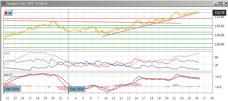 На четырёхчасовом графике пара снова тестировала уровень 133,00 (это уже третий откат от уровня), при этом ранее образовалось медвежье расхождение максимумов пары и гистограммы MACD. Пара находится около линии тренда с 10 сентября. Преодоление этого уровня может привести к откату до 132,00 и далее к 131,50, в последнем случае промежуточный уровень двойной вершины у 133 был бы преодолён и образовалась бы разворотная фигура. По ADX тенденция роста сильная, превышение DM+ над DM- большое и устойчивое, ADX на высоком уровне. Гистограмма MACD в отрицательной зоне, линия MACD сохраняет отрицательный наклон, это показывает ослабление тенденции и может предвосхитить откат.