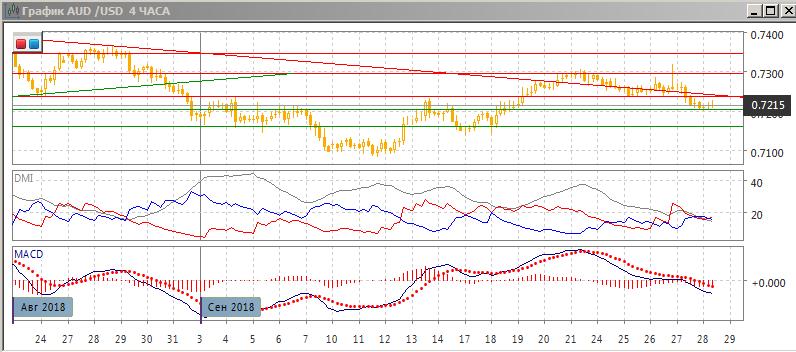 На четырёхчасовом графике пара преодолела уровень 0,7235, после того как уровень тестировался 25-26 сентября. Пара достигла следующего «круглого» уровня на 0,7200. По индикаторам направленного движения тенденцией стало снижение: гистограмма MACD снижается в отрицательной зоне, линия MACD имеет отрицательный наклон. Преодоление уровня 0,7235 делает более вероятным дальнейшее снижение после преодоление уровня 0,7200 с целью на 0,7160, около этого уровня в сентябре было много минимумов.