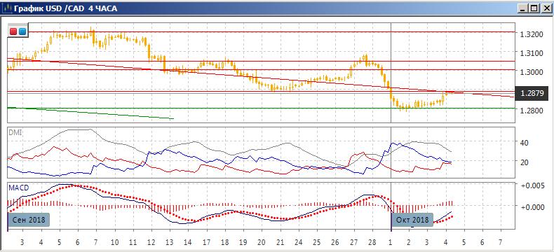 На четырёхчасовом графике пара получила поддержку на 1,2800, после двух дней тестирования образовалась относительно широкая база, после чего пара выросла до ранее преодолённого уровня поддержки на 1,2890. Размер роста по отношению к волне снижения от 27 сентября небольшой. По ADX тенденция снижения сохраняется: DM- существенно выше DM+, гистограмма MACD снижается в отрицательной зоне, линия MACD имеет отрицательный наклон. При закреплении выше 1,2890 следующей целью виделся бы уровень 1,3000.