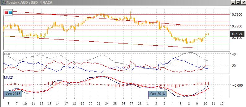 На четырёхчасовом графике пара перешла к росту после преодоления уровня 0,7100. Теперь относительные минимумы и максимумы пары последовательно растут. По индикаторам направленного движения тенденцией стал рост: DM+ выше DM-, гистограмма MACD растёт в положительной зоне, линия MACD имеет положительный наклон. Уровень 0,7100 может выступать сейчас поддержкой. Пока пара выше него, скорее пара продолжит расти в ближайшей перспективе.