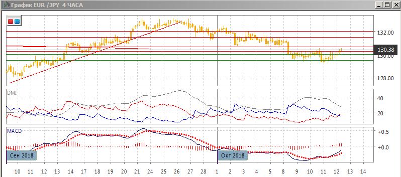 На четырёхчасовом графике происходит консолидация, границы которой можно расширить до 129,50-130,65 (с верхней границей на ранее преодолённом уровне поддержки). Текущая волна роста от 129,50 приостановилась у максимума 10 октября. Пока пара остаётся в консолидации, и в рамках консолидации более вероятно снижение к нижней границе на 129,50, пока пара не преодолела 130,65. Это изменило бы картину и привело к развороту.